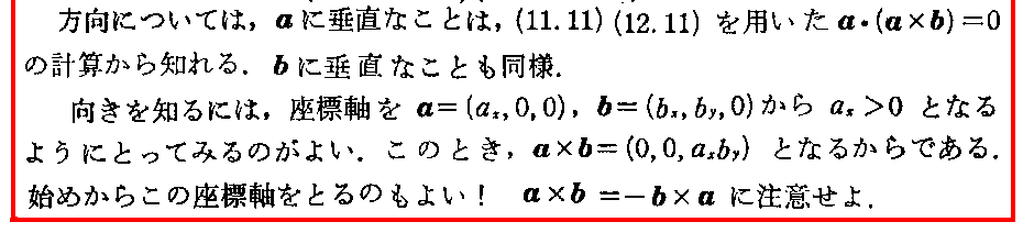 ただしそこでは、本稿とは逆に外積(ベクトル積)の定義としてまず上記後半部の(12.11)式を定め、それから(12.12)式が成り立つ事を証明しています。