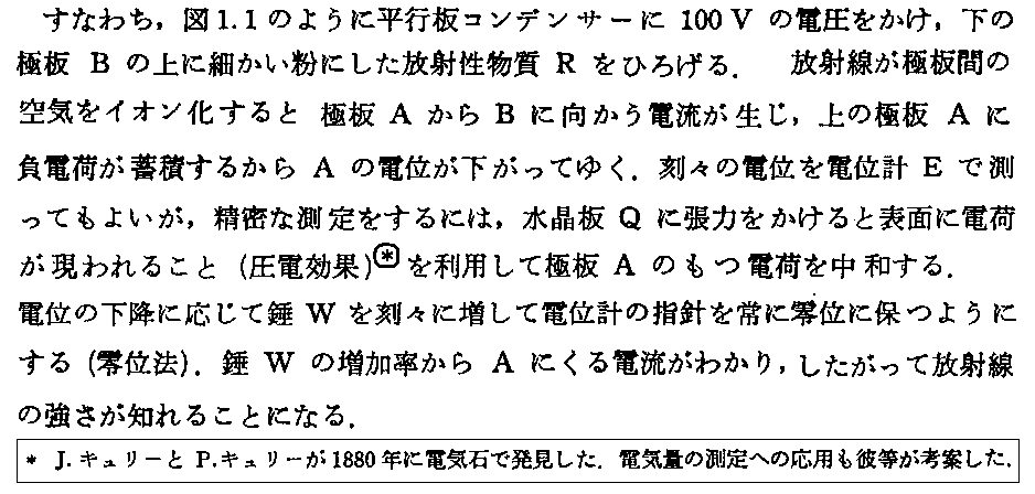 図中の象限電位計Eに付いては、「絶対電位計と象限電位計の測定原理」2.を。あるいは「ラザフォードとソディの放射性変換説(1903年)」3.(2)を参照。