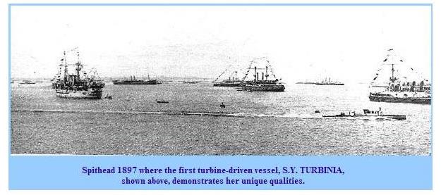 6月26日、大観艦式の当目、そこには160隻以上の英国軍艦が威風堂々と集合していた。それらの中には最新の往復動蒸気機関を装備した新鋭艦もあり、大英帝国の誇りと繁栄を堅持するべく多年にわたって奮闘してきた帆走艦も混っていた。いずれも賑やかに満艦飾を施し威儀を正している。この他にも招待された外国の軍艦や優秀商船があり、さしもの広い錨地が一杯であった。定刻、女王陛下の御召艦が近づくと各艦の発する礼砲はいんいんと響きわたり、式典がまさにクライマックスに達しようという瞬間、錨地の端から艦列の中へ猛然と割込んできた小艇があった。それは女王を迎えてかしこまっている大小の軍艦の間を、波を蹴立てて文字通り縦横無尽に馳巡った。このハプニングに、式場警備の駆逐艦や魚雷艇など、すわ一大事発生とばかり直ちに制止にのり出したが、平素快速を誇っているそれらの艦がやっきになって追回しても、この小さな船の猛スピードには、全然歯がたたなかった。これこそパーソソズのタービニア号であった。