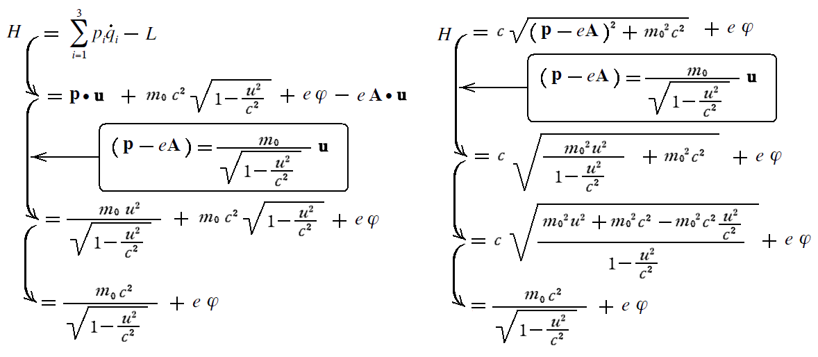 この形の表現では共役運動量pや磁場を表すAが隠れてしまい役に立つとは言えないが、Hamiltonianがエネルギーを表すものであることを理解するには適している。