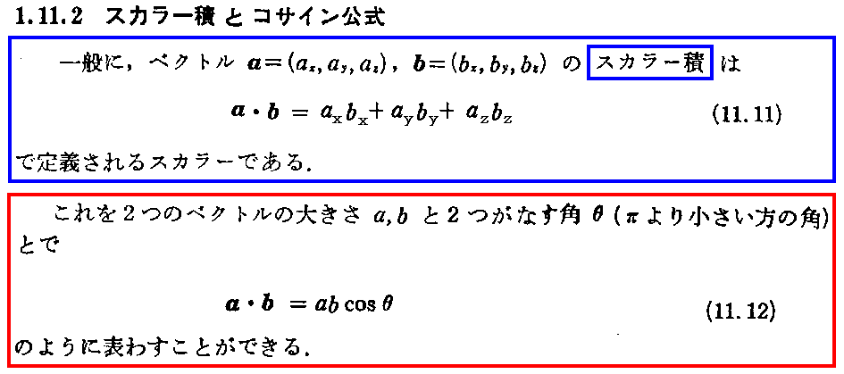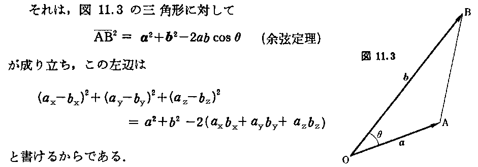 厳密な展開は、「ベクトルの内積(スカラー積)と外積(ベクトル積)の成分表示」1.を参照されたし。ただしそこでは、(11.12)式を内積の定義とし、それから(11.11)式が成り立つ事を証明しています。そして、その応用として“余弦定理”が成り立つ事も証明しています。