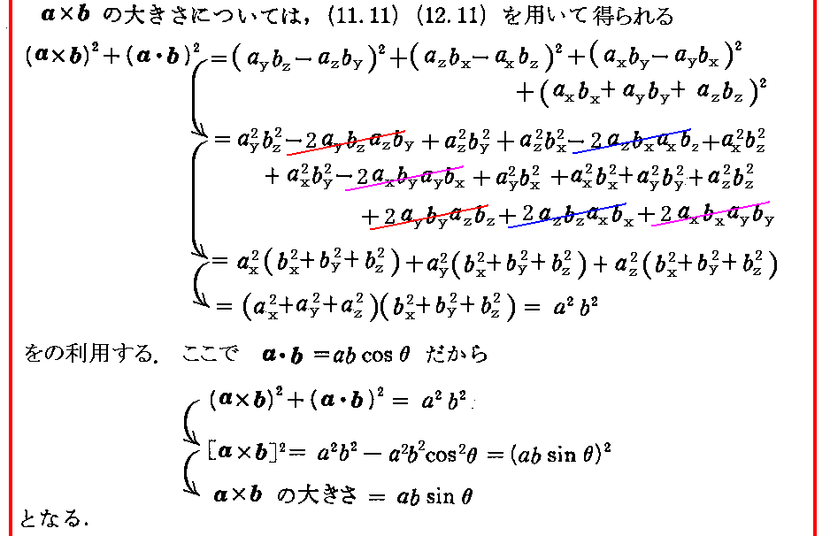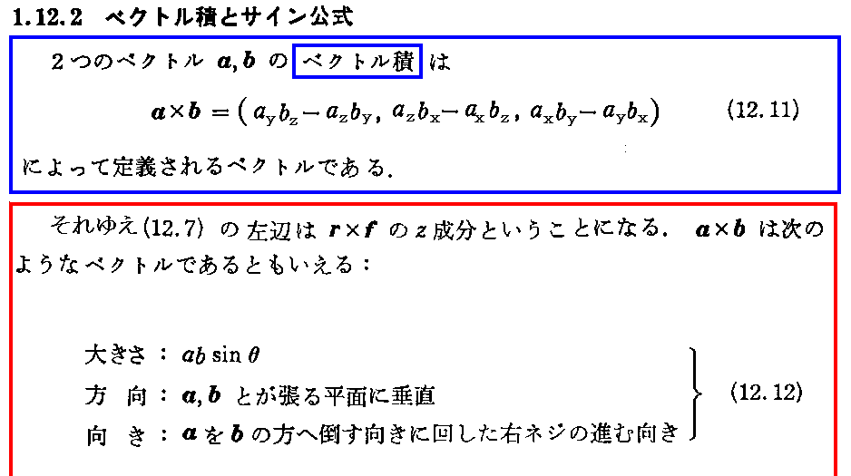 ただしそこでは、本稿とは逆に外積(ベクトル積)の定義としてまず上記後半部の(12.11)式を定め、それから(12.12)式が成り立つ事を証明しています。