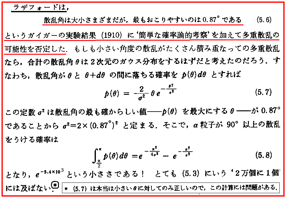 上記(5.6)の数値 0.87°は、確率分布関数に於ける散乱角の二乗平均(分散と言われるもので、この平方根が標準偏差)の事です。さらに、上記の確率論的考察に付いては、「ラザフォードのα線散乱実験と有核原子モデル(1911年)」4.(3)を参照されたし。