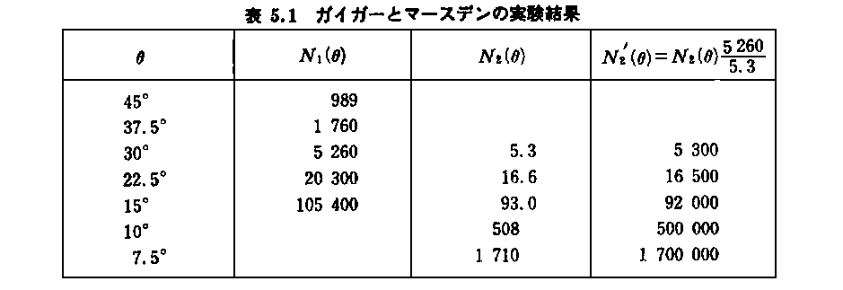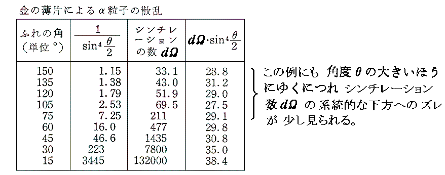これは積dΩ・sin4(θ/2)が非常に広い範囲(約3500倍)で変化するにもかかわらずほぼ一定に保たれていることを示している。つまり、シンチレーションの数が正確に1/sin4(θ/2)に比例していることを表しており、まさしく理論の正当性を確かめることができた。