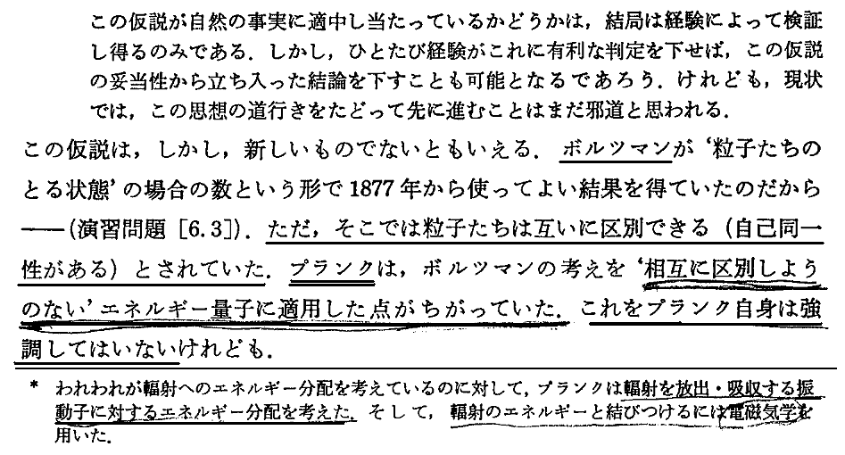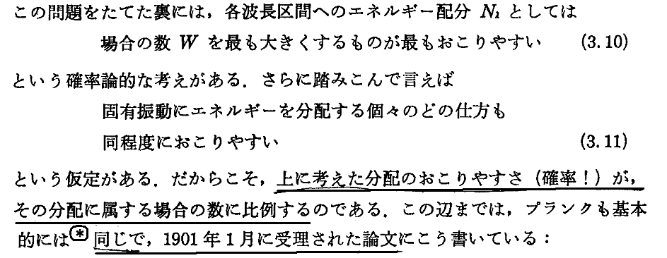 この事に関して、特に8-3-3の□囲み記事が重要で、これはプランクが本文の4.(5)2.で説明している事柄を分配数Wの議論に焼き直したものです。S=kBlogeWであることに注意されて、その部分と比較しながら読まれる良いでしょう。